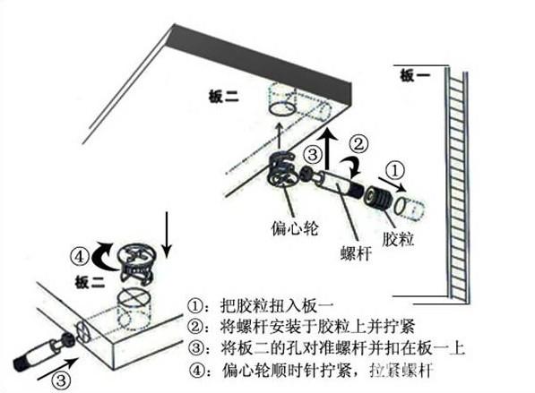 一、用墊布點(diǎn)好地板,先從靠墻的一端寬側(cè)板開始組裝,將寬側(cè)板平放于地面上(離后墻面保持700mm間隔)。首先將填好的三合一膠塞的板件,平放在墊布上,檢查孔距與圖紙相符,并裝上三合一單連桿。然后將固層釘上木塞,固定于寬側(cè)板上面,頂板大柄孔朝上,其余固層都朝下,腳線大柄孔朝內(nèi)(中間固層與L架高度一致,即底板到固層內(nèi)空為960mm,現(xiàn)場(chǎng)打?qū)影蹇祝。放上?cè)板,釘上木塞,木塞要求連通兩邊的固層。在第二個(gè)柜固層上面裝好雙連桿,留意雙連桿上面大柄只能鎖住一半,即90°。當(dāng)兩件固層與側(cè)板固定后再同時(shí)擰緊大柄。裝第三個(gè)柜時(shí)重復(fù)第二個(gè)柜的安裝步驟。 二、釘背板:把裝好的整體柜側(cè)放在點(diǎn)好墊布的地板上面,墊平側(cè)板成統(tǒng)一平面。用拉尺量好柜子的對(duì)角尺寸,調(diào)至相等,從寬測(cè)板處開始裝第一塊背板,留意假如中間有固層釘釘子時(shí),先用鉛筆畫好固層的中央線,再釘釘子。 三、L架的安裝:用L架的側(cè)板在對(duì)應(yīng)的側(cè)板上面一平行線,然后上移9mm畫出三合一膠粒的中央線,用L架的頂班在相對(duì)應(yīng)的底板上面畫一平行線,平線內(nèi)進(jìn)9mm畫出三個(gè)一膠粒的中央線。用10mm鉆頭開孔,孔深10-20mm。裝上單桿。L架裝好后在背板上加釘子固定。清理衣柜安裝位雜物,左右各站一人,衣柜向后稍斜,用力提起,向后移到所需位置留意不要刮花地板、墻壁。